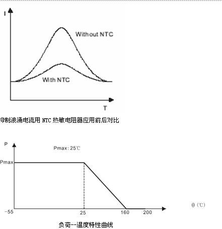 在有电容器,加热器和马达的电子电路中,在电流接通的瞬间,必将产生一个很大的电流,这种浪涌电流作用的时间虽短,但其峰值却很大。在转换电源,开关电源,UPS电源中,这种浪涌电流甚至超过工作电流的100倍以上。因此,必须有效的抑制这种浪涌电流。当电流直接加在功率型NTC热敏电阻器上时,其电阻值就会随着电阻体发热而迅速下降。由于功率型NTC热敏电阻器有一个规定的零功率电阻值, 当其串联在电源回路中时,就可以有效地抑制开机浪涌电流,并且在完成抑制浪涌电流作用以后,由于通过其电流的持续作用,功率型NTC热敏电阻器的电阻值将下降到非常小的程度, 它消耗的功率可以忽略不计,不会对正常的工作电流造成影响。所以,在电源回路中使用功率型NTC热敏电阻器,是抑制开机时的浪涌电流,以保护电子设备免遭破坏的最为简便而有效的措施。